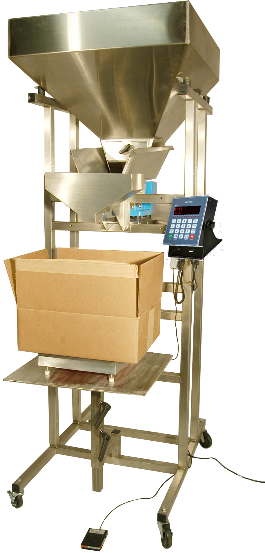 Ζυγιστικό σύστημα πλήρωσης κιβωτίων και σακουλών κάθετης ελεύθερης ροής. Πλήρως ανοξείδωτη κατασκευή με ρυθμιζόμενο δονητικό σύστημα.